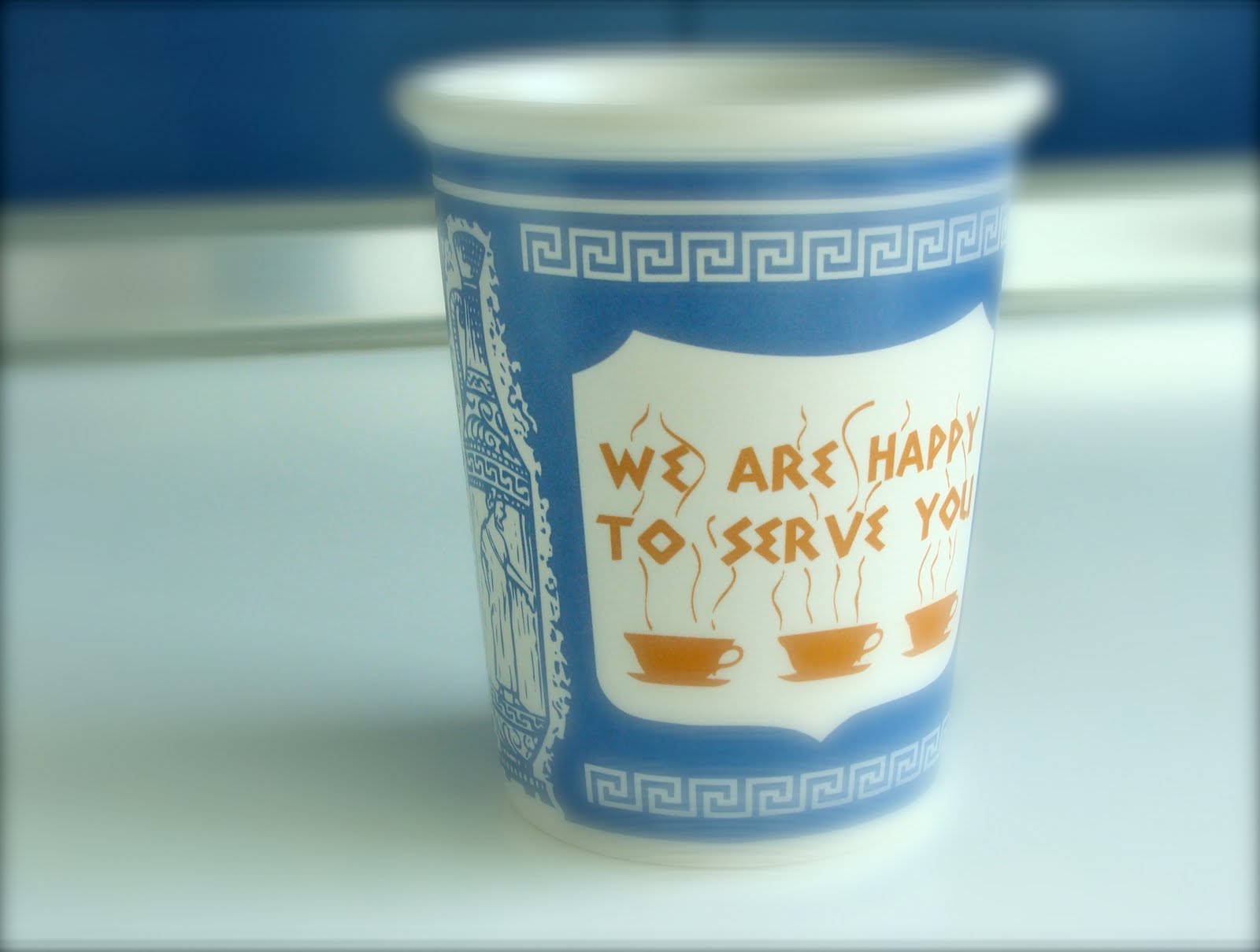 Parece ser que los griegos al emigrar a Nueva York se llevaron consigo su pasión por el café. Muchos de ellos pusieron restaurantes que ofrecían café para llevar y tomar por la calle, lo que es hoy muy típico en la Gran Manzana. Los proveedores de vasos de cartón de estos restaurantes pensaron en hacer un diseño muy griego para esos cafés, con motivos y letras de ese estilo. Durante muchos años el diseño final de ese vaso ha sido inseparable de Nueva York. De hecho, si os fijáis, sale en muchas películas y series todavía, a pesar de que en la actualidad vaya ganando terreno el diseño blanco o los de marcas específicas como Starbucks. En todo caso y aunque tal vez en declive, el modelo, o al menos uno muy parecido, sigue vivo. Así lo demuestra esta foto que tomé en mi reciente viaje a esta ciudad.
