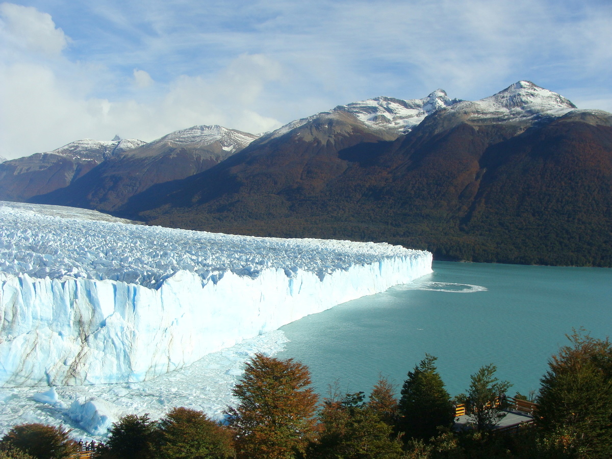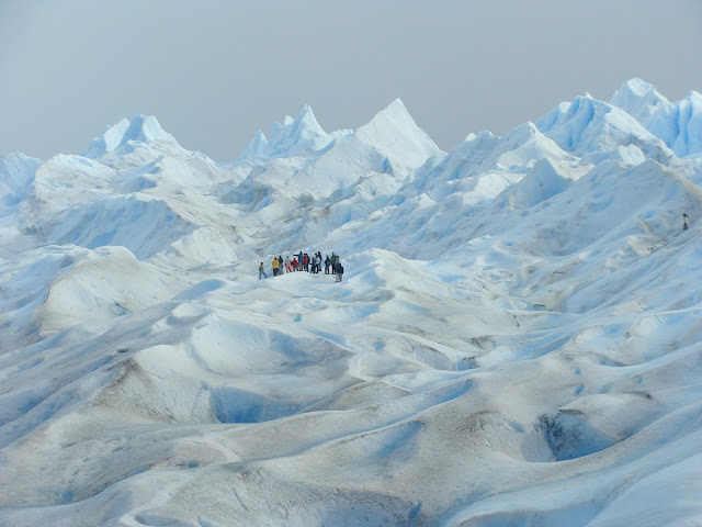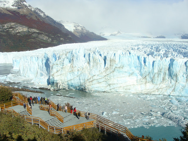 Si que es impresionante el Perito Moreno, las personas parecen hormiguitas, y su superficie irregular con los picos y diferentes colores me encanta, los bosques de lejos parecen una pradera roja.