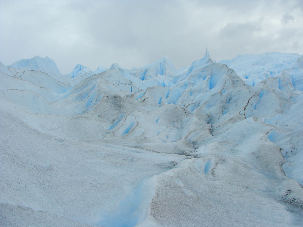 Picos que se extienden similares a una Capadocia helada, formando cuestas y bajadas, estrías grises y negras, extensiones azul y blanco. Picos y formaciones de hielo que esconden grietas, sumideros y agujeros por los que corren riachuelos de agua.