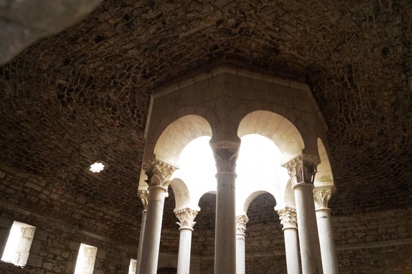 Pero sin duda lo más destacado de la fiesta es que el casco histórico de Girona se llena de adornos en Temps de Flors, así que ya en la ciudad y después de una breve bienvenida en el ayuntamiento, nos fuimos a ver in situ los escenarios de la fiesta. Por allí estaba el muñeco del Tarlà, un personaje que según la leyenda trajo comida y entretuvo a los habitantes de Girona cuando se vieron afectados por la peste. También pisamos el puente de Eiffel, contemplamos las casas de colores del río Onyar, nos adentramos en las callejuelas del Call, el barrio judío y allí descubrimos ventanas adornadas con plantas, que crean un bello contraste con la piedra marrón, pequeños patios y rincones escondidos. Algunos de ellos sólo son accesibles al público en #tempsdeflors, así que están esperando a que lleguéis vosotros para mostrarse. Miramos hacia arriba para poder admirar la iglesia de San Martín y la impresionante catedral, de interior gótico y exterior barroco. La primera se abre todos los años para la fiesta para llenarse de flores y la segunda adornará este año, después de unos cuantos sin hacerlo, su sótano además del claustro románico. Y las escalinatas que dan acceso a los dos templos quedan cubiertas por floridas alfombras naturales durante la celebración. Nosotros lo imaginamos, pero vosotros podréis verlo. Los baños árabes del siglo XII, de inspiración árabe pero de uso por cristianos acaudalados, también son de los emplazamientos más espectaculares de la fiesta, nos cuentan. Y las zonas verdes que rodean los edificios de esta parte de la ciudad, como el convento benedictino del siglo X, son absolutamente idílicos, incluso sin adornos.